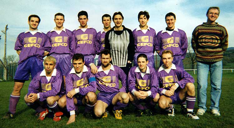 Debout, derrière, de gauche à droite : 1) Nicolas Gerardo ; 2) Gérald Cara ; 3) Guillaume Burdet (St-Germain-de-Joux, frère de 6) ; 4) Marc Etalaz ; 5) Gilles Ferrone ; 6) Mathias Burdet (frère de 3) ; 7) Christian Tournier ; 8) Damien Simonin (debout, travaillant chez MGI Coutier, demeurant à Champfromier).