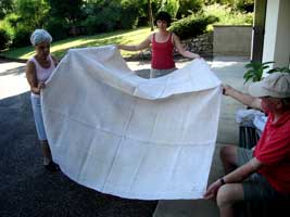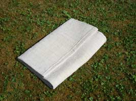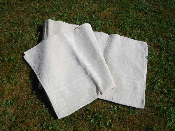 Ce drap de lit en chanvre nous semble aujourd'hui de petites dimensions. Il était pourtant déjà composé de deux lés, chacun de la largeur du métier à tisser, on devine la couture épaisse (grand pli sombre de la photo générale). Ce drap provient du trousseau de César DUCRET [né en 1862, décédé après 1936], cultivateur au Moulin-Dernier. D'ailleurs ses initiales "CD 9" brodées en rouge sur le drap se devinent aussi sur la photo dans le coin (en bas à droite).