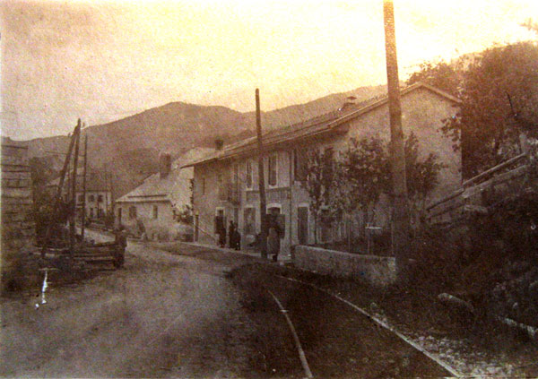 Les photos où l'on voit les rails de l'ancienne voie du tram, à l'intérieur du village de Champfromier sont rares ! En voici une, tirée à partir d'une plaque photo très dégradée, mais montrant bien les rails de la voie du tram à la sortie du village, en direction de Chézery. Elle ne manque pas d'étonner : les rails passent devant la maison sans aucune mesure de sécurité ; automobiles et tram se partagent la chaussée !