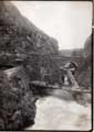La photographie (12,5 cm x 17,5 cm) fut prise dans la direction de Champfromier. Le ponton transversal de travail, fait de simples planches, surmonte les flots tumultueux sans aucune protection ! Il semble prendre appui sur des gabions, sortes d’entassements de blocs de pierres maintenus par un grillage. Le matériel se met en place, on distingue des treuils, enclume et objets divers. Pour l'autre partie du ponton de travail, celle dans le sens du courant, cette fois une protection est en place. Mais pouvait-on se sentier en sécurité avec cette frêle rambarde que l'on distingue sur la gauche du plancher ! Près du bord gauche de la photographie, on voit la "tourne", le lieu où l’eau tournait avant son usage. Il y en avait une aussi avant les scieries de Champfromier. A droite, on ne voit malheureusement pas la cabane du douanier.