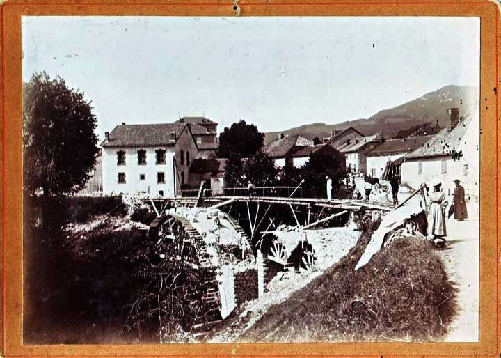 Voici une variante, tout aussi inédite, de la photo sur plaque de la construction du Pont du Tram de Champfromier, en 1909. Celle-ci montre des personnages, probablement des habitants de Champfromier.