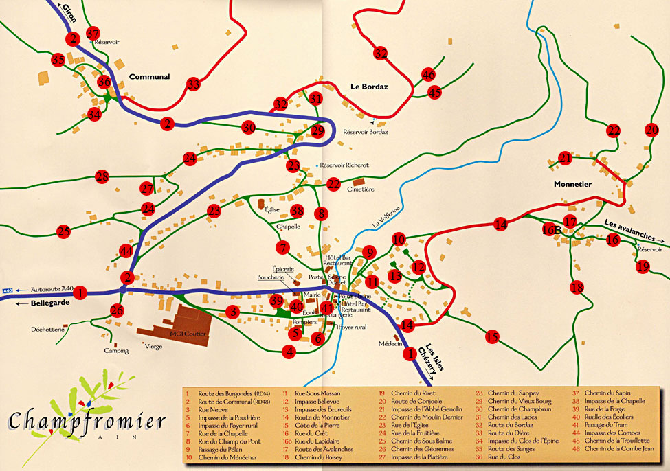 Abbé Genolin (Impasse de l') : 21 Avalanches (Route des) : 17 Bellevue (Impasse) : 12 Bordaz (Route du ) : 32 Burgondes (Route des) - RD 14 : 1 Champ du Pont (Rue du) : 8 Champbrun (Chemin des) : 30 Chapelle (Rue de la) : 7 Clos (Rue du) : 36 |