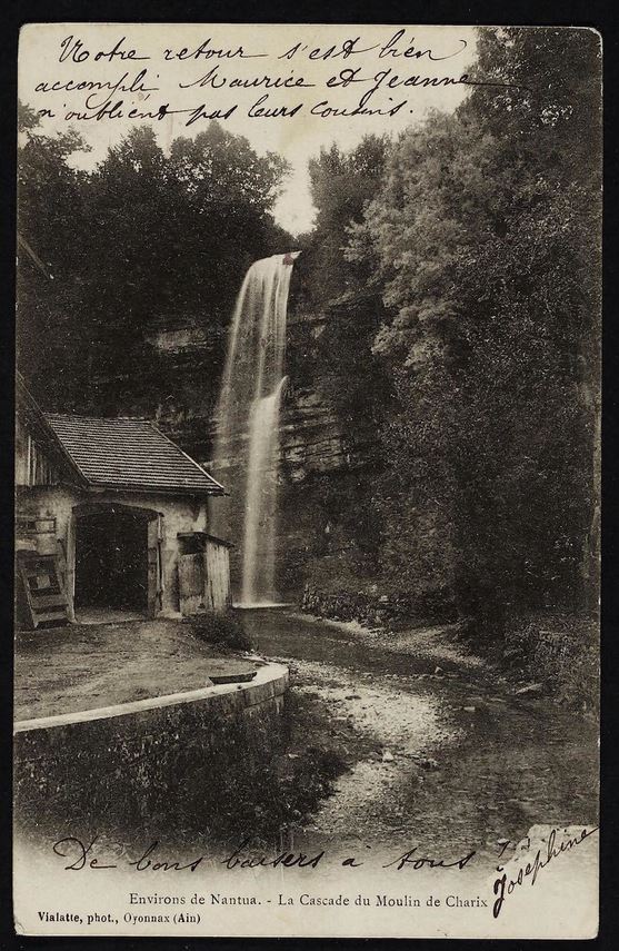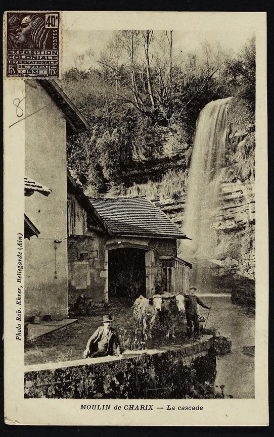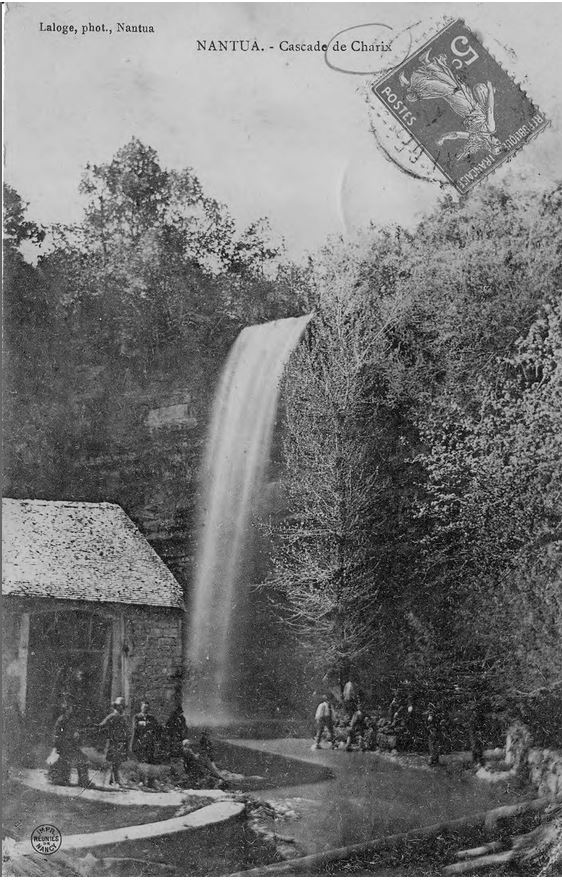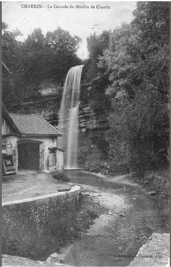 Outre le cliché daté de 1871, et une lithographie bien connue des antiquaires, la cascade de Charix a été très souvent prise comme thème principal de nombreuses cartes postales anciennes (voir ci-dessous). Signalons qu'actuellement le ruisseau de cette cascade prend sa source sous l'autoroute, et qu'il fut certainement jadis bien plus important puiqu'il traverse une pierre percée, encore plus spectaculaire que celle deChampfromier.
