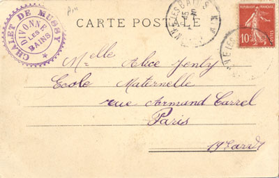 On nous communique aussi une copie en noir et blanc d'un autre exemplaire de cette même carte (timbrée d'un cachet en Suisse) portant la date du 28 juin 1904 crayonnée au recto.