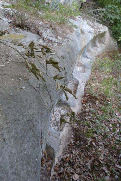 Les cavités furent creusées à la pique (époque romaine ?), avec un agencement concerté et parfaitement réalisé. Au-dessus de ces crèches, la roche fut entaillée, en une belle forme incurvée descendant jusqu'à l'arrière des cuvettes et en permettant ainsi leur usage sur toute leur surface. Elles présentent ainsi un surplomb sur une bonne moitié de leur renfoncement (mais qui ne les protège pas du ruissellement des eaux provenant de la plate-forme supérieure (voir ci-après, un très bel abri situé à environ un mètre cinquante au-dessus des crèches). Entre les cuvettes la roche fut entaillée moins profondément, mais également avec élégance, la courbure commençant au même niveau qu'au dessus des cavités. A gauche des crèches, la roche présente en hauteur deux marches facilitant l'accès à l'abri supérieur.