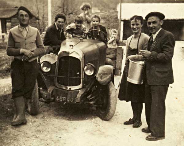 Autre traclet, celui de René Coutier (avec béret, à gauche). La photo fut prise, en 1951, au début du printemps, à côté de la « fruitière », devant la maison du docteur DUCRET (actuelle maison Borgalli) qui y venait en vacances (logement au niveau de la chaussée) et où la famille de René COUTIER logeait, en contrebas de la route, au niveau du pré. Ce traclet avait été aménagé avec caisson en bois à l’arrière. A droite, Madeleine Ducret-Gauchet, épouse de René, et Maurice Ducret (époux de Yvonne Coutier, jeune sœur de René). Le jeune homme à l'arrière-plan, à gauche, est Guy Ducret-Tcho (voisin, fils de Mme Reine VERCHERE). A côté de lui, il y a Jean-Louis DUCRET le fils de Maurice, puis les trois aînés de René Coutier et Madeleine Ducret : André COUTIER au volant ; Françoise COUTIER debout derrière ; et Joseph COUTIER encore petit, assis à l’arrière. Roger COUTIER n’était pas encore né.