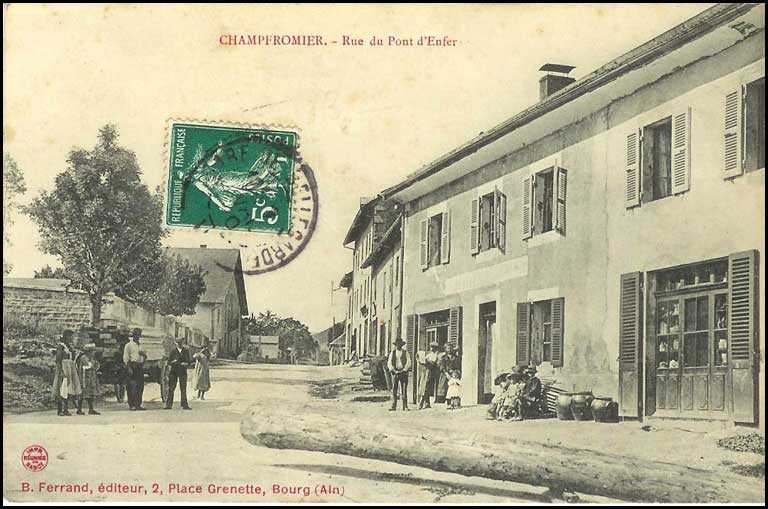 Au premier plan en bas, on voit une grume de la scierie Ducret. A gauche, le bâtiment dit l'O.N.U. (actuelle boucherie), comme on dit encore, en souvenir de cette maison où logeaient de très nombreux travailleurs étangers de la scierie (italiens, polonais, etc.) Derrière avec le toit horizontal, un lavoir communal démoli. [Jean et Micheline Vallet]. A droite la Boulangerie-cordonnerie (bien qu l'on semble vendre des jarres plutôt que réparer des chaussures). L'on se souvient que Melle Bornet, la boulangère, ne vendait son pain que suivant ses caprices, pas de pain si l'on en avait eu la veille, ou si votre tête ne lui revenait pas ! |