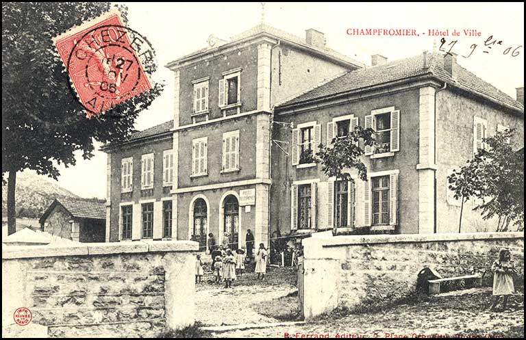 A doite sur la partie centrale, panneau POSTES TELEGRAPHES. La poste se trouvait à droite du bâtiment, au rez-de-chaussée, mais avec accès par la partie centrale où se trouvait le guichet en forme de verrière, et le logement pour le postier était au-dessus. Micheline Nicollet se souvient, elle portait les télégrammes. Quand une sonnerie retentissait dans la maison de ses parents, elle se précipitait à la poste, prenait le télégramme et allait le porter au plus vite au domicile indiqué ! Au milieu du bâtiment est la mairie, qui était précédemment au presbytère. A gauche et derrière, au rez-de-chaussée, se trouvaient les trois classes de l'école. Du temps du couple des instituteurs Favre les classes étaient surchargées, 40 élèves et même 60 dans la petite classe, avec 3 enfants par table et d'autres assis par terre dans les allées ! Mme Favre était de forte corpulance et personne ne bronchait. Mais l'on savait aussi récompenser les enfants sages. Ils descendaient alors à la cave où se trouvait la récolte des pommes des instituteurs, et l'enfant pouvait choisir sa pomme, un vrai bonheur ! [Jean et Micheline Vallet]. Voir la variante 159, numérotée 2082. |