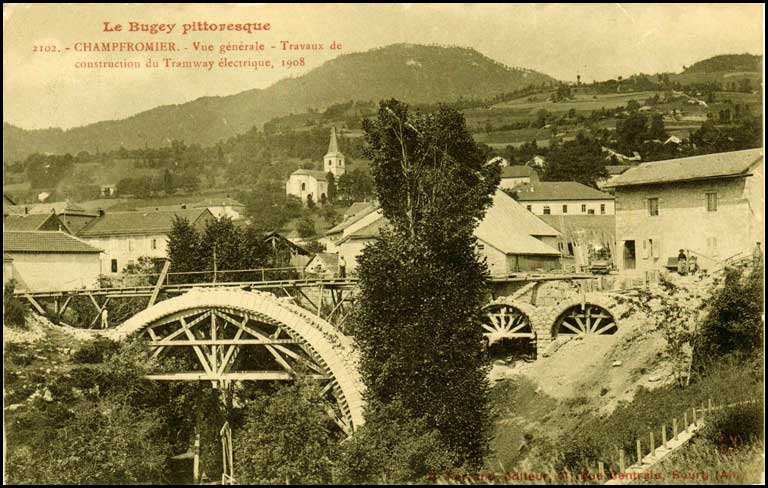 Le Bugey Pittoresque // 2102. - CHAMPFROMIER. - Vue générale - Travaux de construction du Tramway électrique, 1908 |