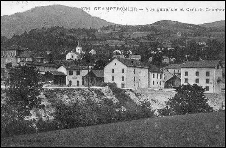 A gauche on distingue la Mairie-Ecole-Poste. Sous l'église, la gare. La maison centrale est celle construite par Victor Ducret. En bas à droite était l'entrée (en demi sous-sol) de l'écurie (pour les bœufs), et à sa gauche se trouvait un entrepôt de la scierie (huiles, scies, limes,etc.) Le rez-de-chaussée (semblant ici au premier étage) était l'habitation de Joseph Ducret, aîné et codirecteur de la scierie de Victor, et de sa femme Hélène, tandis que le premier était l'habitation d'Auguste, deuxième des frères et codirecteur, et de sa femme Julie, maison où je suis née [Mme Simone Avet]. La maison suivante à droite est l'actuel hôtel Ducret (alors occupée par un lapidaire, et avant d'y ajouter un étage pour la transformer en hôtel). A droite encore la scierie puis le moulin avec sa roue extérieure sur le pignon. |
