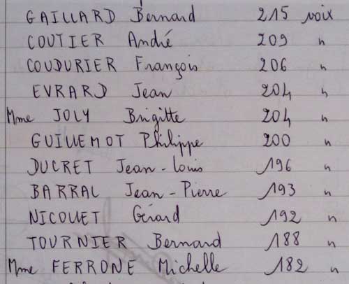 Les 4 nouveaux sont : Barral Jean-Pierre, Mme Féronne Michelle, Guillemot Philippe et Mme Joly Brigitte, élus à la place de Ducret Georges [7594], Mme Gaillard Rose [Rose Salvi], Garon-Guinaud Daniel [boulanger] et Vuillermoz Aimé [7533].