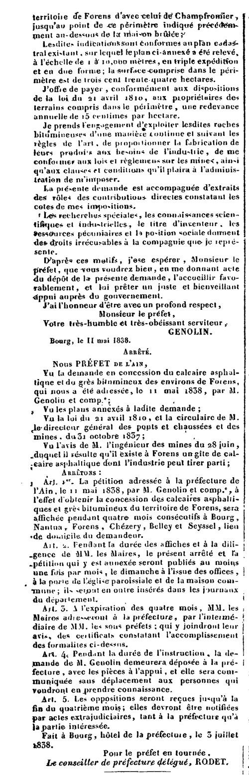 Après la faveur accordée à Marinet par la préfecture, une année s'écoule sans prise de décision. Finalement, après de vraisemblables tractations dont nous n'avons aucune information, M. Genolin, modifie sa demande et informe le préfet qu'il la réduit à une expérimentation, et pour une année seulement ! Dès lors cette nouvelle demande est satisfaite par un arrêté du 16 août 1839. Le ministre des Travaux publics autorise provisoirement M. Genolin à extraire chaque jour 5 m3 de calcaire bitumeux sur les "gîtes" de Forens dont il sollicite la concession ; "le calcaire extrait devra être exclusivement employé à des expériences" ; cette autorisation n'est accordée que pour une année.