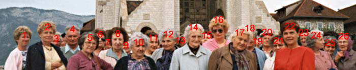 1) Rose Gaillard, née Salvi (épouse de Marcel) ; 2) Micheline Vallet, née Nicollet (épouse de Jean 20) ; 3) Albert Tournier, dit Bébert ; 4) Jean Farlay (Monnetier) ; 5) Solange Pillard (Monnetier, venant de la Combe d'Evuaz) ; 6) Laure Nicollet ; 7) Annie Tournier, née Donjon (épouse de Bébert 3) ; 8) Germaine Verchère, née Lacarin (épouse de Maurice, sapeur-pompier à Paris) ; 9) Aimée Tournier, née Famy (épouse d'André) ; 10) Marthe Gamberi, née Cartant (Poisey, épouse de Groisanne?) ; 11) Marie-Louise Vallet, née Ducret (épouse de Marcel) ; 12) Reine Grenard, née Verchère ; 13) Albino Rota ; 14) Marthe Ducret, née Tournier (épouse d'Henry) ; 15) Berthe Chevron, née Mermillon (épouse de Julien) ; 16) Adrienne Vitali, née Sampietro (épouse de Stephano) ; 17) Marie-Rose Guichon (dite Rose), née Ducret-Meunier (épouse de Laurent) ; 18) Maria Rota, née Fachinetti (épouse Albino 13) ; 19) Denise Ducret, née Tavernier (épouse de Léon) ; 20) Jean Vallet ; 21) Andrée Grenard, dite Dédée, née Ducret-Thadet (Sous-Massan) ; 22) Simone Avet, née Ducret-Lyset (épouse d'Albert, présidente) ; 23) Marie-Rose Tavernier, née Hugonnet (épouse de Robert) ; 24) Marie-Louis Dhériat ; 25) Fernande Suro, née Ducret-Thadet (épouse de René) ; 26) Jeanne Coutier, née Moine (épouse de Cyrille).