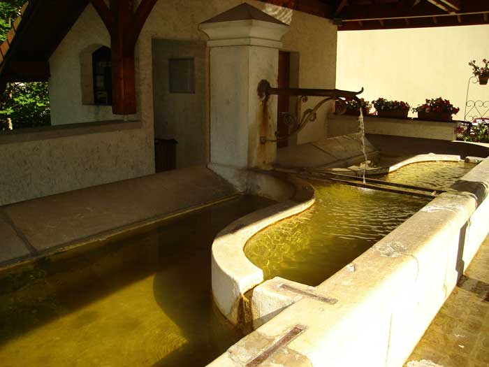 Puis on passait à la partie centrale du lavoir, là où coule en permanence l’eau pure et fraiche de nos montagnes, pour le rinçage. Un drap était tenu aux quatre coins, on y mettait les autres à l’intérieur, et on faisait couler l’eau sur l’ensemble du paquet afin d’avoir des draps parfaitement propres. C’était fini ? Non, il fallait encore les sécher. Tordre les draps aurait permis de bien faire s'évacuer l’eau, mais cette essorage vigoureux les aurait froissés et aurait nécessité un repassage complet. Pour l’hôtel, on préférait donc les plier soigneusement et les poser sur les plans inclinés du lavoir afin qu’ils commencent à s’égoutter d’eux-mêmes.