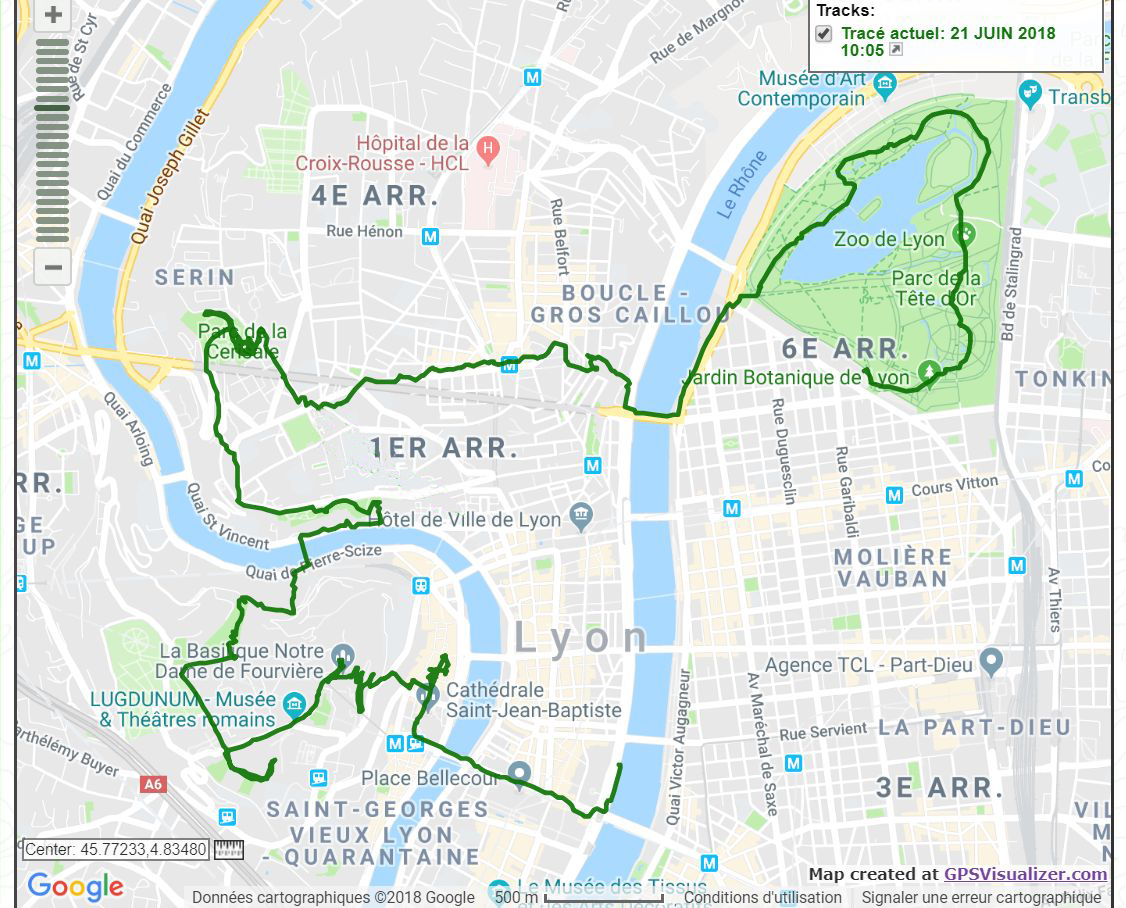 Voici une sortie, organisée par Les Amis des Sentiers de Bellegarde (21/06/18) et qui nous a fait découvrir le Parc de la Tête d'Or (lac, zoo, tulipiers en fleurs, etc.), les escaliers depuis le Gros Cailloux, le Parc de la Cerisaie (pique-nique) et le Clos des Canuts (un cru Gamay, confidentiel, jumelé avec celui de la République de Montmartre !), jardin des Chartreux, traversée de la Saône sur la passerelle de "l'homme de la Roche", grimpette de la montée de la Sarra par le Parc Aventure (acrobranche spectaculaire pour les enfants), Jardin de la Visitation (couvent reconverti en luxueux 4 étoiles), stèle de la fondation de Lugdunum et un point de vue panoramique sur les ruines romaines, la basilique de Fourvière et ses roseraies à la descente, le vieux Lyon et ses traboules (sans oublier ses boutiques de brioches aux pralines, limoncello et autres souvenirs !), enfin la cathédrale.