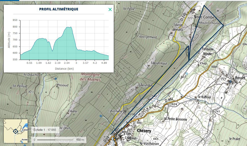 Montée de 600 à 700 mètres, puis descente à 600 mètres jusqu'à la culée du pont (non balisée) et reprise de la montée jusqu'à environ 800 mètres, avant retour.