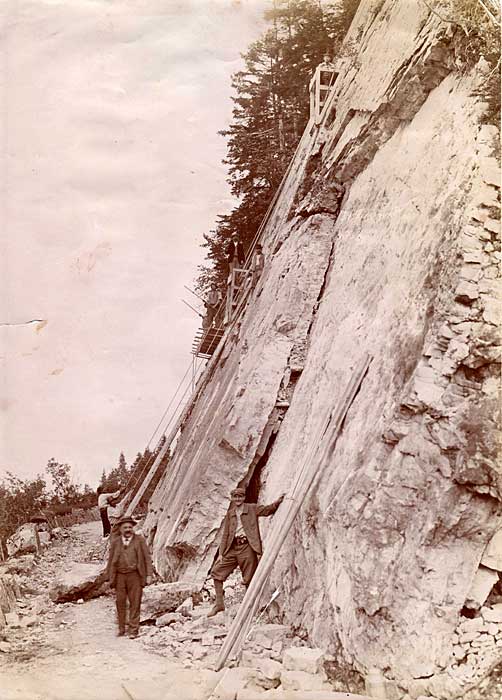 La vue d'ensemble montre l'étroit chemin des Avalanches, en partie déblayé. Au premier plan se trouve le même personnage que sur la précédente photographie, lequel est présumé être M. Obrandy. Derrière lui, deux autres ouvriers portant aussi le chapeau maintiennent des cordes qui semblent stabiliser au niveau de la plateforme un ascenseur en bois coulissant sur une échelle. Aussi au premier plan, un quatrième personnage, un peu dandy, porte casquette, pantalon bouffant et chaussettes à motifs losangés ! Cinq autres personnes sont visibles, deux sur la plateforme, un sur l'ascenseur du même niveau, un dans les rochers, et enfin un tout en haut qui semble aussi sur un ascenseur, stabilisé. Encore une fois, on observe un matériel rudimentaire constitué de longue échelle et d'échafaudage suspendu en bois, de cordes et de barres à mine.