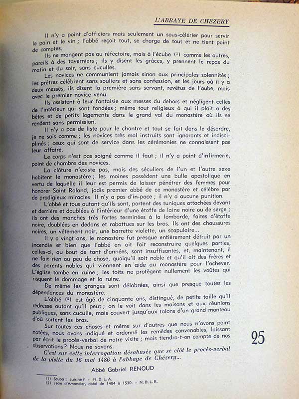 La revue Visage de l’Ain (t. 38 de 1957, pp. 24-25), publie un article de deux pages titré L'Abbaye de Chézery en l'an 1486, sous la plume de l’abbé Gabriel Renaud. Il s'agit du rapport de la visite de l'abbaye en 1486. Notons que la traduction comporte des imprécisions, pour avoir été réalisée à partir d'un original en latin de lecture très difficile.