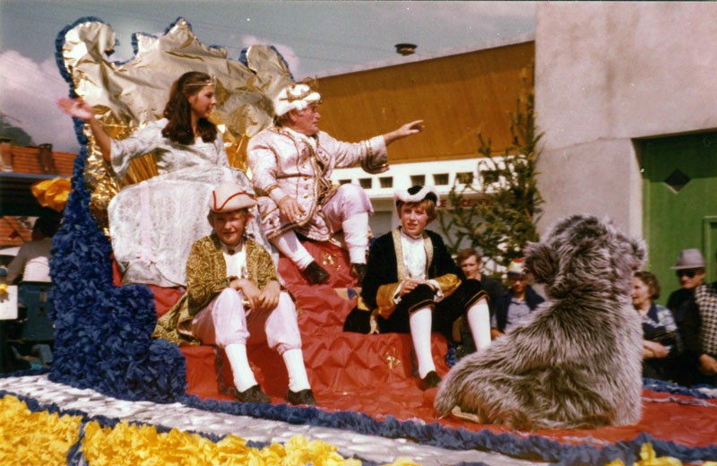 Le corso 1975 ? Les contes de Perrault en étaient le thème. Au pays des fées, tout est possible ! De même pour l’Amicale des Classes, qui s’est inspirée avec une merveilleuse précision dans la recherche et l’exécution des chars. Ils étaient tous originaux, fidèles et saisissants. Devant le trône royal, doré et fleurdelysé, le Chat Botté demandait pour son maître la main de la princesse : un ensemble à la fois sobre, net et somptueux. La pauvre Cendrillon [2 chars], assise devant la cheminée, accueillait la bonne fée, sa marraine, et ne savait pas que l’énorme citrouille de son jardin (une merveille de trouvaille et de réalisation) l’emporterait bientôt vers sa belle aventure. Son soulier perdu fut retrouvé par deux petits rats qui, le trouvant joli et confortable, s’y étaient installés (encore une idée originale et amusante très appréciée). Le pont-levis étant relevé, nul n’est entré dans le Château [la Belle au bois dormant]. Tout était minutieusement étudié. Tours crénelées aux sombres meurtrières, échauguette d’angle, fossé. Mais la belle était réveillée et le prince charmant était à ses genoux. Et puis nous avons vu le loup dans le lit de mère-grand. Les enfants étaient saisis. Le charmant Chaperon Rouge, assise au bord du sentier, avait posé son panier et rangeait ses fleurs en un bouquet. Deux fillettes parmi les spectateurs, lui soufflaient à mi-voix : n’y va pas, n’y va pas, dans la maison y a le loup ! (Sur le vif). Ce char, œuvre de l’Association du Sou des Écoles, a particulièrement conquis le jeune public.