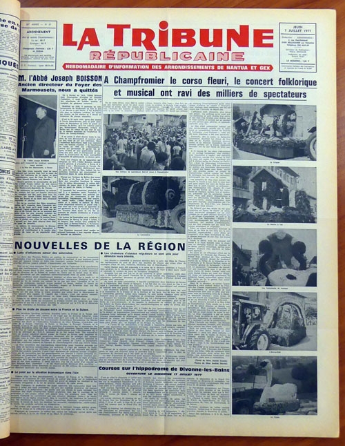 [Légendes des photos] Des milliers de spectateurs étaient venus à Champfromier ; la Locomotive ; le Criquet ; le Moulin à eau ; les Instruments de musique ; L’Arc en Ciel ; le Cygne (Texte de Mme Jeanne Coutier. Photos de Mme Andrée Ducret)" [La Tribune Républicaine, édition du 7 juillet 2017].