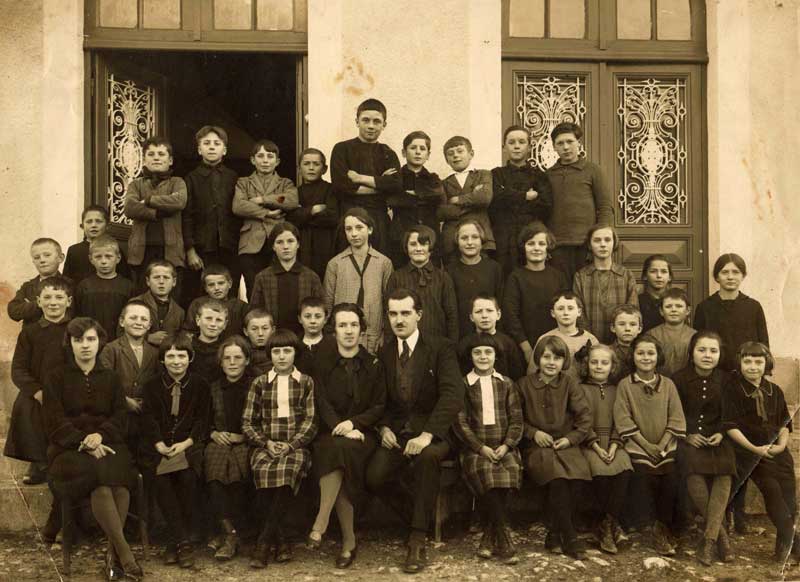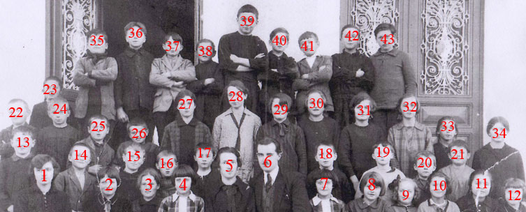 Au premier rang : 1) Melle Paule Jeanne DOCHE ; 2) Odette NICOLLET (sœur de 12) ; 3) Germaine DUCRET-CESAR ; 4) Reine DUCRET-GAUCHET (sœur de 7, ép. Poncet, d'Apremont) ; 5) Félicie PINARD (ép. Colombat) ; 6) Léon COLOMBAT ; 7) Lucienne DUCRET-GAUCHET (sœur de 4) ; 8) Louise COUTIER (sœur de 30 et 31, ép. Evrard, de Communal) ; 9) Rose VUILLERMOZ ; 10) ... Poncet ou Ducret ; 11) Yvonne VACELET ; 12) Adèle NICOLLET (sœur de 2) ;