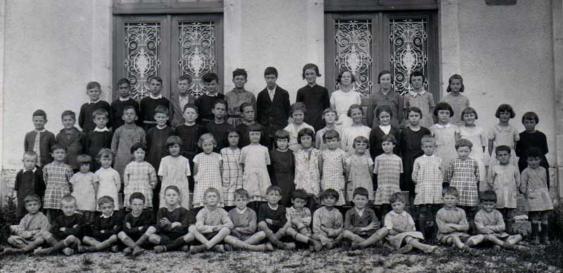 Cette photographie a été prise devant l'actuelle mairie de Champfromier. Tout le monde y est, sauf les instituteurs, soit 61 écoliers de tous les niveaux allant de l'accueil dès 4 ans jusqu'au CEP. Léon Colombat était l'instituteur, des garçons, tandis que Félicie Pinard, son épouse, était institutrice des filles. Une troisième enseignante, Marguerite Vernay en 1936, avait la charge des petits, garçons et filles.