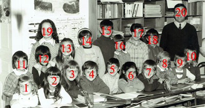 1) Christelle GAILLARD ; 2) Sandrine GAILLARD (sa cousine) ; 3) Isabelle GAILLARD (sœur de 1) ; 4) Christian TOURNIER ; 5) Marita COSTA ; 6) Cécile VILA-FLOR ; 7) Philippe RICHEROT (Fils de Denis) ; 8) Florence ALCARAZ ; 9) Valérie GAILLARD (sœur de 2) ; 10) Eric RICHEROT (Frère de 7) ; 11) Nadine TODESCHINI ; 12) ... (?) MOREIRA FERNANDEZ ; 13) Patricia RICHEROT (sœur de 7) ; 14) Christine ESCRIBANO ; 15) Tonio (?) ESCRIBANO (Frère de 14) ; 16) Nathalie VERCHERE ; 17) ... ... ; 18) Ulysse OVAL-MARTIN ; 19) Marie-Pierre TOURNIER (sœur de 4) ; 20) Pierre RONCIN, instituteur.
