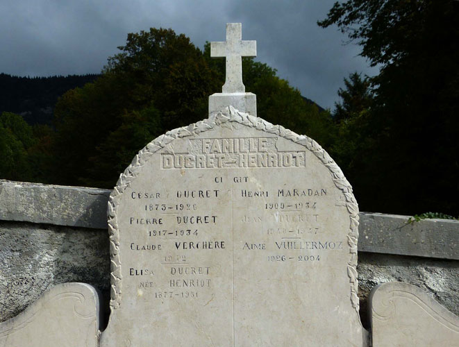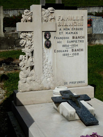 Edouard Bianchi fut tailleur de pierre. Il a réalisé de nombreuses décorations florales sur des dalles tombales en pierre du cimetière de Champfromier, des roses pour la sienne, une guirlande de feuilles de lierre pour celle Ducret-Henriot (tombe n° 70, contre le mur du fond).