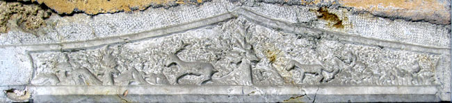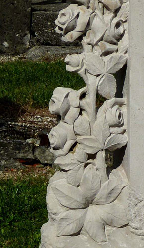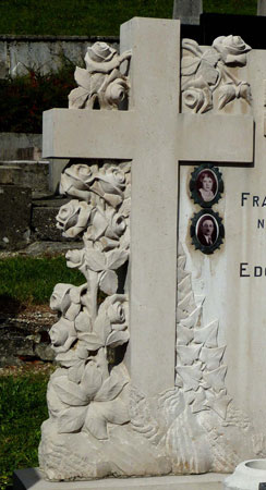 Edouard a donc sculpté de nombreuses pierres tombales en calcaire, avec une prédilection pour les roses, les marguerites et les feuilles de lierre ou de chênes. Il a aussi réalisé l’hôtel de la Ste-Vierge de l’église de Champfromier, et en Suisse, avec son frère, la salle des fêtes de Gland, où ils furent invités pour l’inauguration. Un important éditeur de Lausanne, la famille Gonin, faisait aussi régulièrement appel à ses services, allant le chercher et le reconduire, pour enjoliver leur magnifique demeure privée à colonnes de style Renaissance, au Col de la Faucille. Dans le Pays de Gex et en Suisse, il a travaillé pour plusieurs entreprises, et nombre de bâtiments portent des pierres de taille anonymement taillées par un certain... Edouard Bianchi.