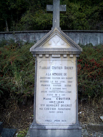 Non loin de l'angle nord-ouest du cimetière, adossée à la route de Moulin-Dernier, se trouve une tombe recouverte d'une modeste dalle en béton. La pierre tombale, provenant de l'ancien cimetière, est placée verticalement à l'arrière de la tombe et est surmontée d'un chapiteau triangulaire orné d'un cœur central, lui-même dominé par une croix. Caveau d'une "Famille Coutier-Ducret", y sont inhumés les époux, tous deux morts en 1880, et trois de leurs enfants, dont "Marie COUTIER / 1867-1943". Mais qui d'entre nous sauraient encore dire que Marie-Eulalie Coutier-Rey fut la seule institutrice qui exerça à la Combe du Collet, lieu-dit de Champfromier limitrophe des communes de Montanges, St-Germain de Joux et Giron. Par ailleurs sa carrière se place à la charnière entre la formation des instituteurs dans des écoles religieuses et les débuts de l'enseignement laïc par des enseignants formés dans les Ecoles Normales. Les choix politiques des préfets, inspecteurs et maires interfèrent alors avec les compétences...