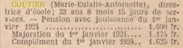 Dans la rubrique « Vœu du fonctionnaire », Marie Eulalie fait noter par le nouvel Inspecteur de Trévoux : « Je désire ma retraite le plus tôt possible. », souhait pressant qu’elle réitère par courrier le 27 novembre 1923. Ce dernier vœu, après 33 ans passés en Dombes dont 27 à Savigneux, est exaucé. Elle a 56 ans, mais elle est épuisée. La voici au Journal Officiel de la République Française du 29 mars 1924, sa pension civile lui étant accordée par le Ministre des Finances de Raymond POINCARE.