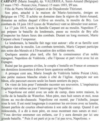 Notons que le couple Carpant-Thirionet fut témoin de la bataille de Waterloo au moulin de BRY, ainsi que leurs enfants, et en particulier Marie-Joseph CARPANT, enfant en 1815 (future épouse De Valeriola, parents de Thérèse De Valeriola, épouse en secondes noces de Luc-Marie Ducret) ; elle fut interviewée peu avant sa mort par le New York Times pour témoigner de la bataille du Moulin de Bry et évoquer leur rencontre avec Napoléon, venu observer les lieux depuis leur moulin la veille de la funeste bataille ; puis de la famille donnant, la nuit venue, à boire aux soldats français gémissants... Elle mourut au Poizat, âgée de près de 90 ans, après avoir communiqué ses souvenirs de la Grande Histoire !