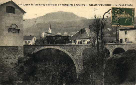 On a du mal à imaginer maintenant Champfromier au temps des champs de céréales ! L’ancien moulin communal, situé au Pont d’Enfer, est pourtant pour témoigner d'un passé agricole qui fut même florissant. Depuis le pont, sur la route départementale qui va à Chézery, on aperçoit un bâtiment imposant sur la Volferine, mais nombreux sont les passants qui ignorent que c'est l'ancien Moulin Communal. Sur les anciennes cartes postales on voit encore la roue du moulin, vestige de son usage à l'époque où l'énergie était transmise par la télémécanique, avec de gros câbles reliant cette roue, par l'intermédiaire d'un pylône, à une turbine située en aval dans le lit de la Volferine.