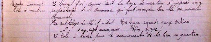 Les cultivateurs de la commune qui font moudre leur blé et autres céréales (méteil, orge, seigle, avoine, maïs) doivent payer une taxe de mouture :