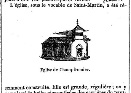 La monographie imprimée considérée comme la plus ancienne de Champfromier est celle contenue dans l'ouvrage "L'Arrondissement de Nantua", par Théodore Ogier. Sans date mentionnée, des recoupements permettent de savoir qu'il fut publié au milieu du XIXe siècle. Si l'ouvrage, et en particulier la page Champfromier (p. 31) comporte beaucoup d'erreurs, celle-ci a du moins le mérite de nous donner une représentation de l'église de Champfromier à cette époque, la seule qui soit connue avec son ancien clocher !