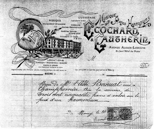 Le 8 juillet 1909 le curé Bornuat écrit encore au Directeur de l’administration des Domaines pour obtenir la restitution de son harmonium, dont il possède les factures acquittées en les 30 mai 1903 et 8 février 1907. Ces factures au nom de Ecochard-Gaucherin à Bourg sont jointes pour un acompte de 350 francs puis le solde de 100 francs.