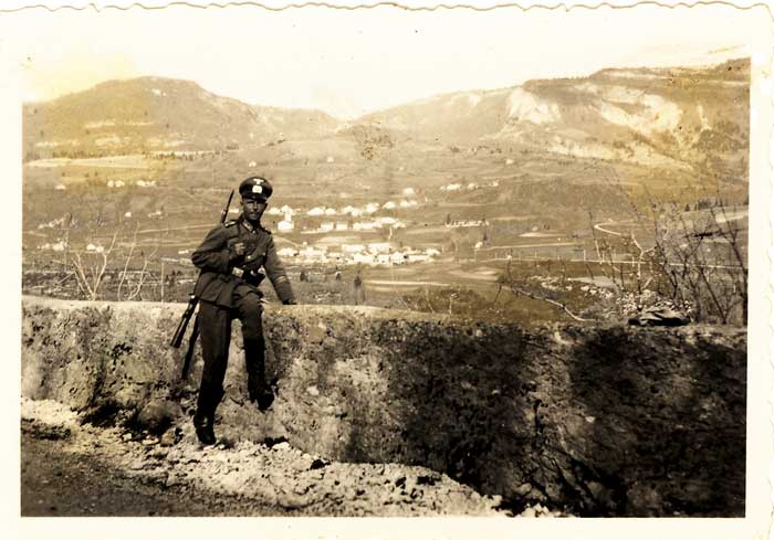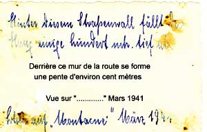 "Derrière ce mur de la route se forme une pente d'environ cent mètres. Mars 1941" Et derrière la Valserine était la zone libre, une vue imprenable... Au fond se dessinent le Cruchon et le Truchet de Communal. Champfromier apparaît en espaces allongés et étagés, en bas les habitations de la route du Pont d'Enfer, au milieu l'église et ses quelques maisons voisines, plus haut l'actuelle rue de la Fruitière, et encore au-dessus les maisons du hameau du Bordat. A droite on remarque la route de Chézery et voie du tram, plus haut la boucle de la route de Monnetier.