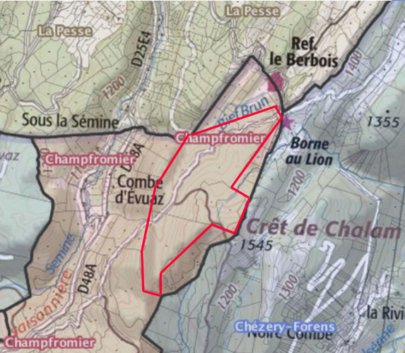 Les deux parcelles abergées aux Montangers, dites provenant des mandement et terroir de Montanges, sont à situer dans le losange décrit ci-dessus, actuel territoire de Champfromier, mais sans aucune mention de superficie et avec des lieux-dits en partie oubliés, il est difficile de les positionner avec certitude. On verra toutefois, par la vente de deux parcelles en 1636, que le domaine initial était plus grand que le domaine actuel, incluant les Nerbier et Ramas, la possession des Nerbier sera d'ailleurs précisée en 1565. La première parcelle abergée en 1439 est désignée par ses confins : "du lieu dict le Cunillact jusques en l’hault du Tamiset tendant vers le Pralet, et de là jusques à l’Encrenaz, et aussi de ladicte Encrenaz par l’hault du mollard de Challamoz". Elle engloberait donc une garenne (du latin, cunilus, lapin), le sommet du Tamiset, l'Enquerne et le Crêt de Chalam (ou l'actuel Mollard, commune de Chézery). Histoire complexe, cette parcelle appartenait à trois frères Mathieu de Forens, et avait été "rendue" par l'abbé de Chézery (aux terres de Nantua)...