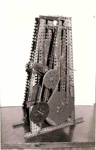 Crée en 1901, la société britannique Meccano développa sa filiale française dès 1912, proposant aux enfants (et plus…) un jeu éducatif de constructions techniques en lames métalliques perforées au pas de ½ pouce, avec roues et engrenages en laiton. Quel adulte n’a pas joué un jour avec les charnières Meccano de 26 trous !