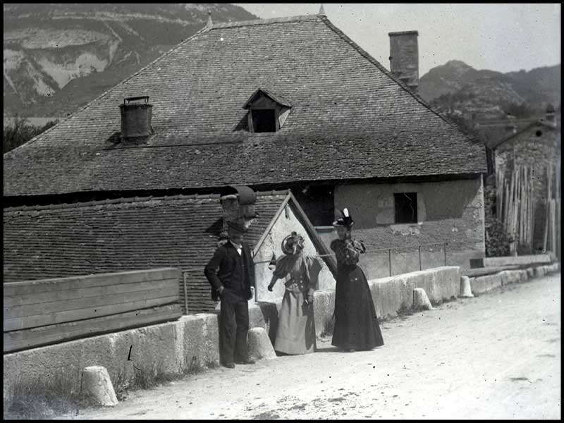 Champfromier ne manquait pas de charme, à la Belle Epoque, témoins ces personnages endimanchés, et cette magnifique vue du Pont d'Enfer et de la "Maison Evrard", rue des Burgondes à Champfromier. La photo sur plaque ci-dessous est attribuée à Marius Chapuis, ancien opérateur des Frères-Lumières puis ébéniste et maire de Champfromier. Il avait épousé, en 1905 à Lyon, Marie Clémentine MARTIN dont les parents demeuraient à Champfromier.