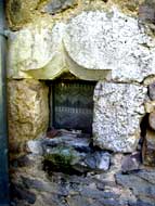 Une croix se trouve au-dessus du sigle IHS (Jésus Sauveur des Hommes). En dessous, sont figurés les trois clous de Jésus mort sur la croix (un pour chaque main et un pour les deux pieds). On les voit souvent placés comme ici et associés à IHS. La sculpture est élégante et réalisée avec un souci du détail et de la finition, un clou de ce linteau présente encore une sculpture en forme de flèche bien marquée à une extrémité.