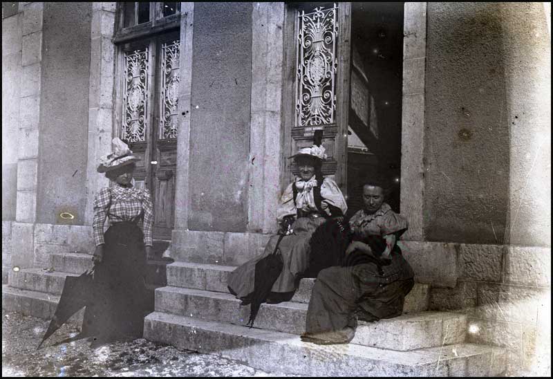 Il n'a malheureusement pas été possible d'identifier les 3 personnages. Même nos plus ancien(ne)s du village ne les ont pas reconnus, et ajoutent même n'avoir jamais vu de telles tenues de femme lorsqu'ils étaient enfants, ce qui fait donc reculer la prise de vue à une date antérieure à 1922. On ne pourra donc que supposer que ces gens sont des Lyonnais, de la famille ou des amis de Marius Chapuis, ou des Champfromérands, du Pont-d'Enfer ou plus probablement de la forge Eloi Ducrest. On reconnait d'ailleurs deux des femmes se trouvant sur la plaque-photo prise devant la maison Ducrest.