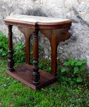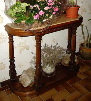 Ci-dessous, voici deux exemplaires de consoles. Si le plateau est le même et la façade identique avec l'élégant ré-emploi de deux balustres et de la main courante en bois des îles, par contre les parties arrières sont traitées de manière très différentes. A voir aussi, ci-desous, une autre de cette même série de balustres, intégrée dans une jolie sellette porte vase.