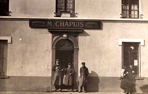 Marius Chapuis (1878 Lyon - 1961 Champfromier), ancien maire de Champfromier, n'avait que 19 ans en 1897 lorsqu'il revenait de Russie où il avait été opérateur des Frères Lumière ! De retour à Lyon ses parents préférèrent alors orienter leur fils aîné vers un métier moins risqué, et il fit des études d'ébéniste, et pour preuve son grand livre d’ébénisterie de styles de toutes époques qu'il conservera toute sa vie... Ebéniste il fut donc, et il commencera son activité à Lyon, comme on le voit sur une carte photo, au numéro 30 (présumé rue de Jonage, vers 1907/09).