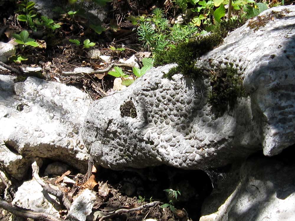 | Ce site de coraux était visible à Champfromier depuis le chemin forestier de la Biche, dans les rochers du dernier virage avant d'arriver à Haute Crête (alt. 1380 m env.). Le site a été presque totalement pillé entre juillet 2009 et juin 2014. | |