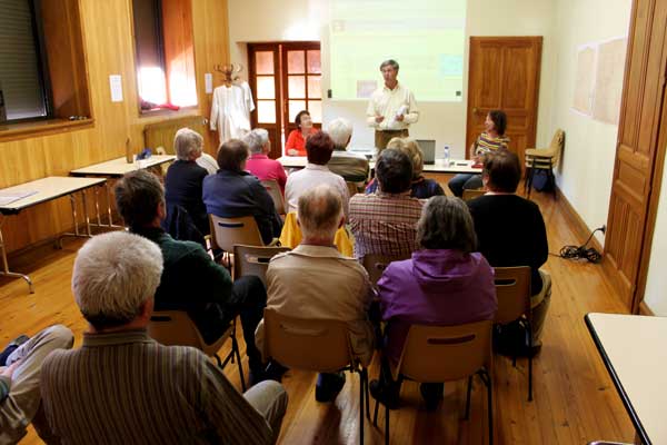 La séance se poursuit par une projection au vidéo-projecteur donnant des fonctionnalités très utiles mais peu connues pour se déplacer dans le site, puis par les liens de la page "Première visite". Elle s’achève par la présentation des deux visites d’une maison privée aux peintures murales de scènes de marine en méditerranée et du château de Montanges.