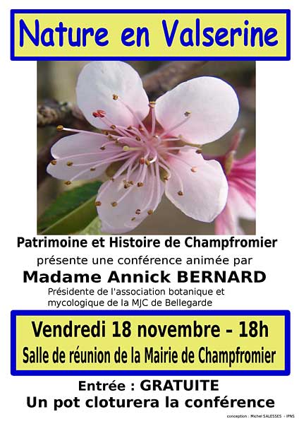 Vendredi 18 novembre 2011, 18 heures : Nature en Valserine (flore, faune, champignons, etc.), conférence et diaporama par Annick Bernard, présidente du Club mycologique et Botanique de la MJC de Bellegarde. Salle de réunion à la mairie de Champfromier. Pot de l'amitié. Entrée : GRATUITE. Contacts : Régine Vallet (regine.vallet@gmail.com)