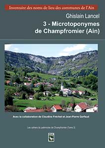 Les microtoponymes (toponymes locaux) de Champfromier : format A4 (210 mm x 297), 200 pages noir et blanc, 24 planches couleurs dont la totalité des feuilles de plan napoléoniens (vers 1833), un millier de lieux-dits et 3.500 références d'archives citant presque toutes les familles propriétaires de Champfromier, un ouvrage réalisé par Ghislain Lancel, Président de Patrimoine et Histoire de Champfromier, avec l'aide des linguistes de l'institut Pierre Gardette de Lyon.