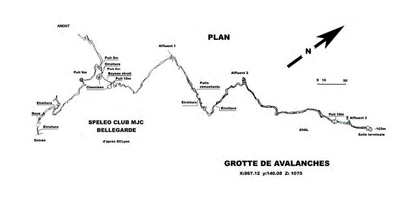 Retournant dans le méandre actif, de dimension correcte il nous mène sans trop de difficultés à la salle terminale (-103m), non sans laisser sur notre gauche deux arrivées d’eau en siphons. On passe à la base d’une série de puits remontants. Le ruisseau s’infiltre au travers d’un colmatage de blocs et de boue sans beaucoup d’espoirs de continuation ; le courant d’air qui parcours la cavité semble se perdre plus en amont dans les puits remontants. D’importants travaux de désobstruction pourraient permettre de suivre le cheminement principal du cours d’eau. ll faut noter que cette salle terminale, contrairement au méandre actif, est tapissée de boue, ce qui laisse penser qu’elle doit se mettre en charge lors des crues.