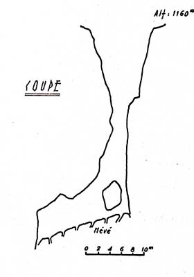 Le rapport d'exploration (n° 2229, du 14 juillet 1952) signale que le gouffre s'ouvre dans une zone très fissurée, et mentionne une entrée en forme rectangulaire (8m de longueur, 5m de largeur et 12m de profondeur) puis un puits vertical de 3 à 5 mètres de diamètre, aboutissant à une salle obstruée par un névé. La profondeur atteinte est de -33 mètres (et la température de 1°). "Le névé doit être permanent, nous avons trouvé à sa surface des cartouches de guerre entièrement oxydées, ce qui montre que la neige n'a pas fondu depuis 1944". Des rhinolophes (chauve-souris) morts de froid ont été trouvés.